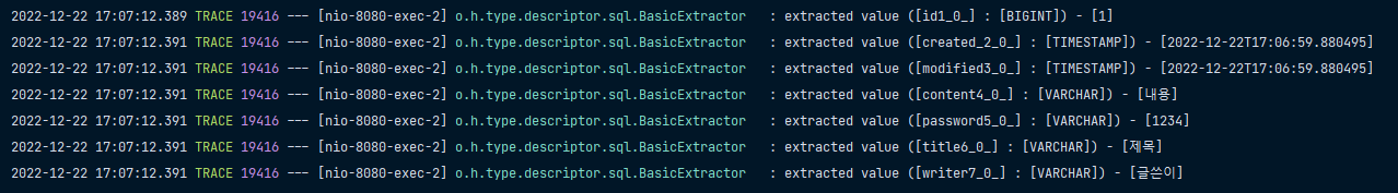 Hibernate: insert into board (id, created_at, modified_at, content, password, title, writer) values (default, ?, ?, ?, ?, ?, ?)